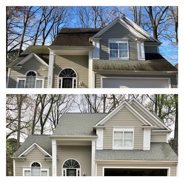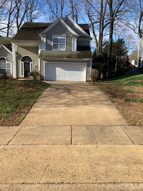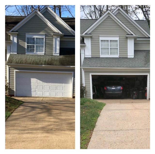 For this project, we did a house wash, roof cleaning, driveway cleaning, and gutter cleaning in Huntersville, NC. For the house wash, we soft washed using a biodegradable solution applied using low pressure and rinsed using low pressure to remove all the organic growth, dirt, and cobwebs. For the roof cleaning, we also used a low pressure biodegradable solution to remove all the black organic growth called gloeocapsa magma, an bacteria that eats on the limestone in your shingles and ruins curb appeal. For the gutter cleaning, we removed all the leaves and debris from the gutters and rinsed the gutters and downspouts with water to ensure they were flowing properly. We applied a solution to kill all the organic growth for the driveway cleaning and cleaned with a professional surface cleaner.